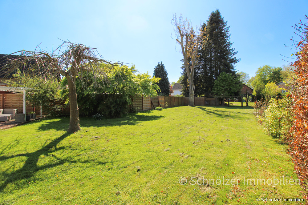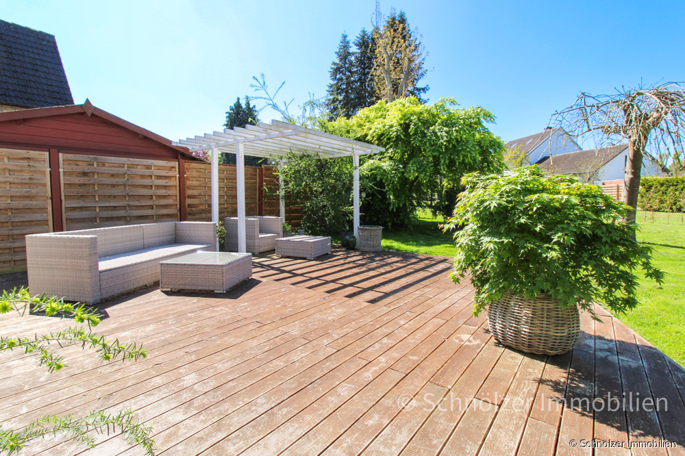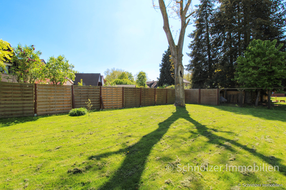 Der Garten ist sonnig und pflegeleicht angelegt und bietet viel Platz für Freizeit, Spiel und Erholung- ideal zum Toben für die Kinder. Eine praktische Gartenhütte schafft zusätzlichen Stauraum für Gartengeräte oder Fahrräder.