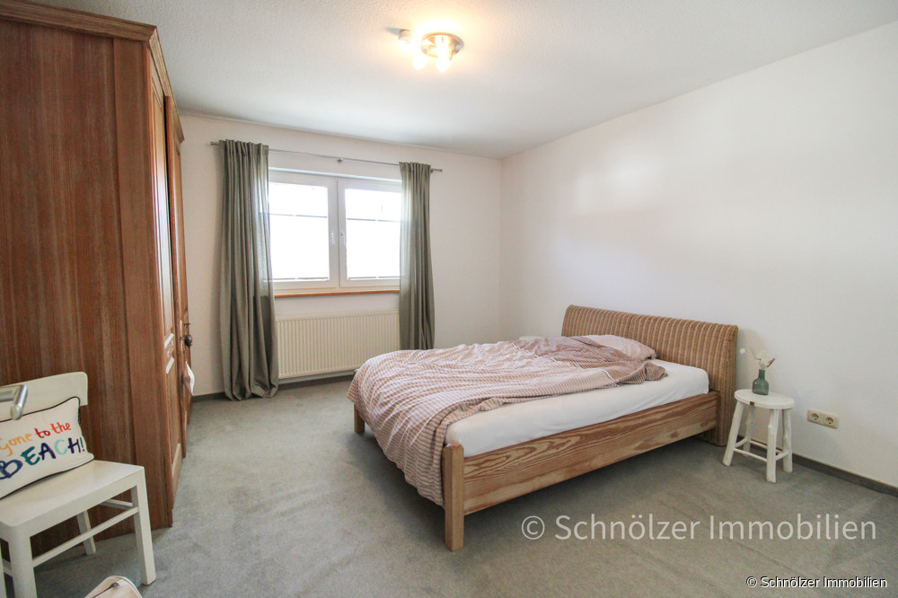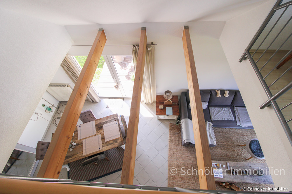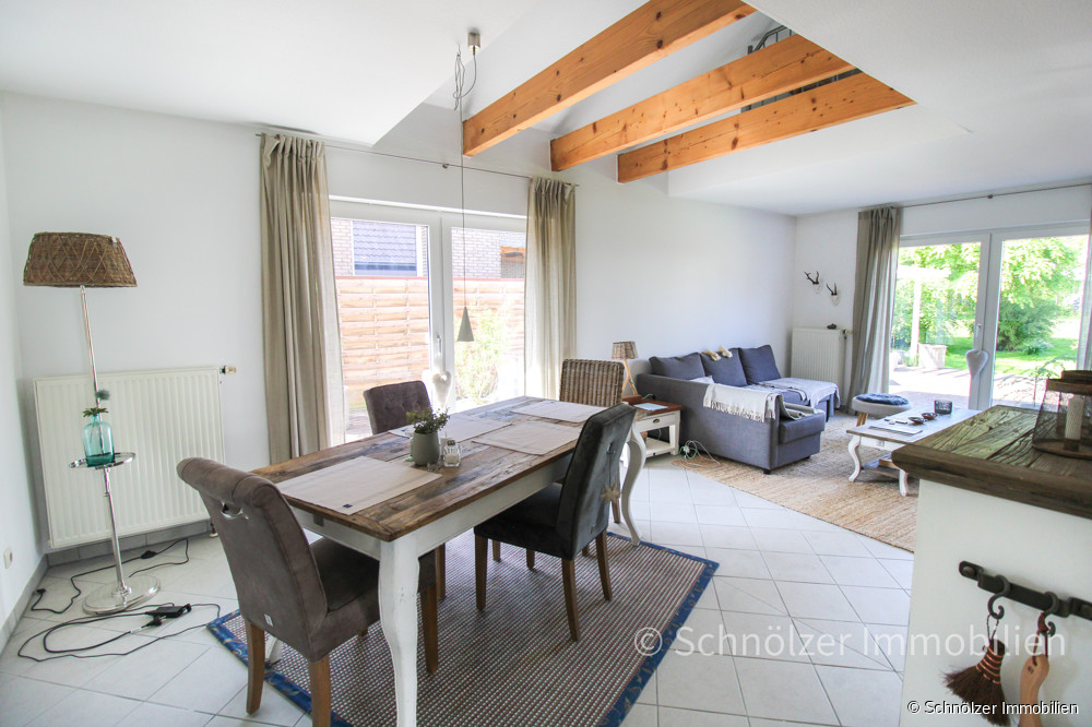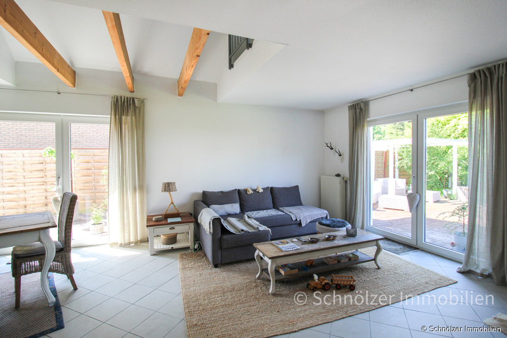 Der Eingangsbereich empfängt Sie mit Licht und Großzügigkeit. Von hier aus geht es in das Herzstück des Hauses – der offene Wohn/- und Essbereich mit stilvollensichtbaren Holzbalkenelementen in der Galerie. Große Fensterflächen sorgen für viel Licht und einen freien Blick in den pflegeleichten Garten. Von hier aus gelangt man direkt auf die große Südterrasse, die sich um das Haus zieht und viele Sonnenstunden verspricht. An kalten Tagen wärmt Sie der Kaminofen und sorgt für gemütliche Stunden.