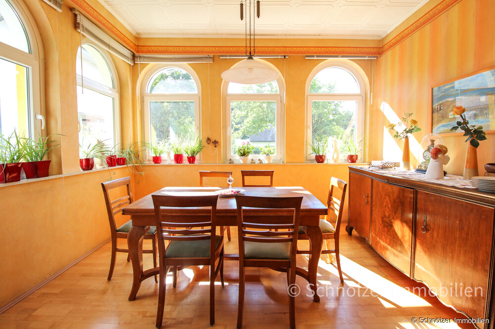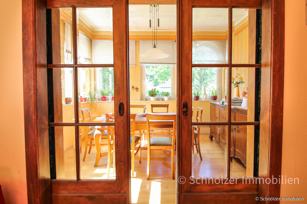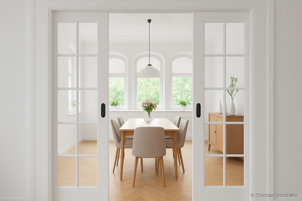 Von hier aus erschließt sich das Erdgeschoss mit seinen besonderen Highlights. Der lichtdurchflutete Wintergarten mit klassischen Bogenfenstern dient als elegantes Esszimmer und bildet den Mittelpunkt des Hauses. Das repräsentative Wohnzimmer beeindruckt mit einer kunstvoll gestalteten Stuckdecke und einer stilvollen Holzschiebetür mit Facettenglas, die den Raum harmonisch vom Wintergarten trennt. Zwei weitere Zimmer bieten flexible Nutzungsmöglichkeiten als Schlaf- oder Arbeitsbereich. Ergänzt wird diese Ebene durch die Küche mit praktischem Abstellraum sowie den direkten Zugang in den Garten, der das Wohnerlebnis perfekt abrundet.
