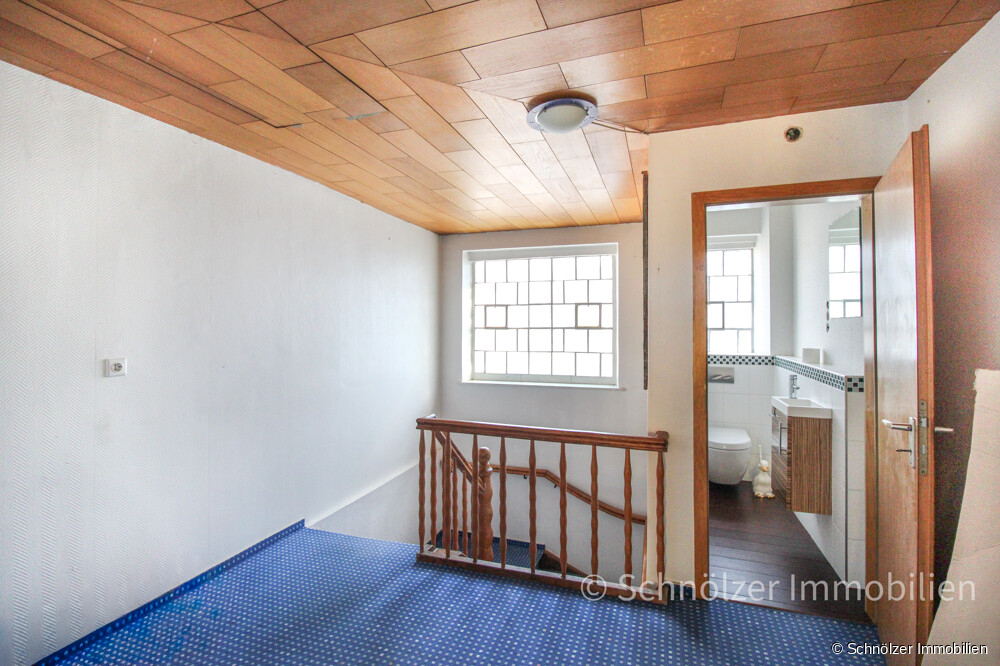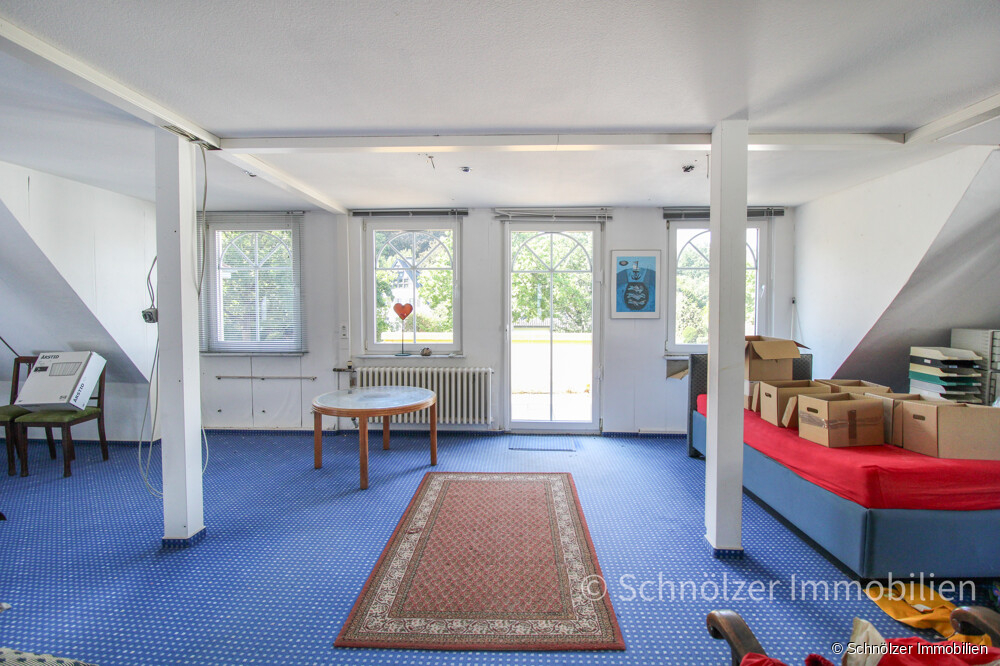 Bereits 1971 erfolgte der großzügige Dachgeschossausbau. Aktuell präsentiert sich das Dachgeschoss als großzügiger, offener Wohnbereich mit Gäste-WC, einer Küche und Zugang zum Balkon. Diese Etage lässt sich bei der notwendigen Renovierung individuell aufteilen und bietet vielfältige Gestaltungsmöglichkeiten – von einem weitläufigen Loftcharakter bis hin zur klassischen Zimmerstruktur. Zudem eröffnet sich hier die Option, eine eigenständige zweite Wohneinheit mit einem eigenen Eingang zu schaffen, ideal für Mehrgenerationenwohnen oder eine Kombination aus Wohnen und Arbeiten unter einem Dach.