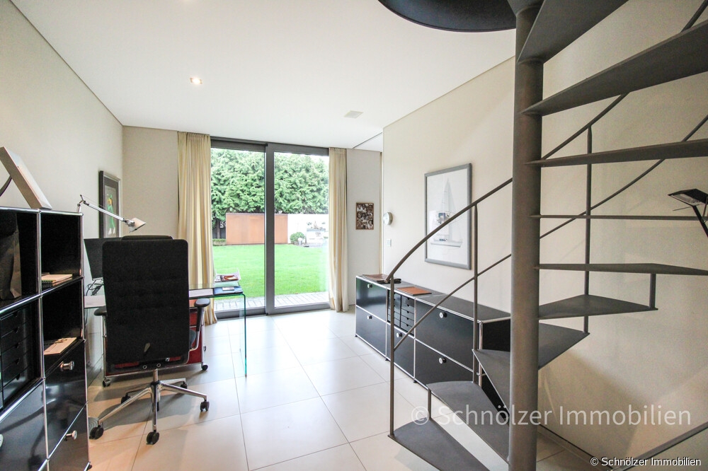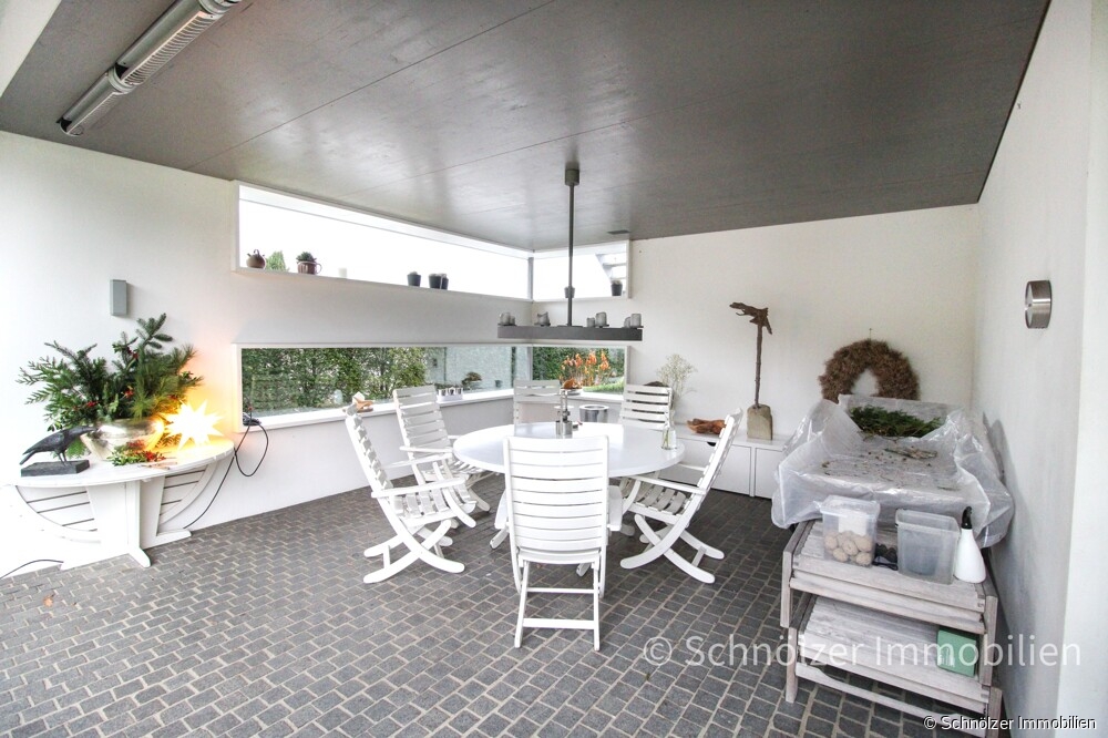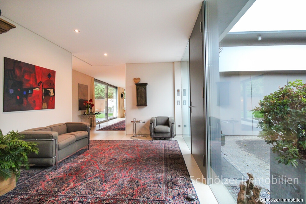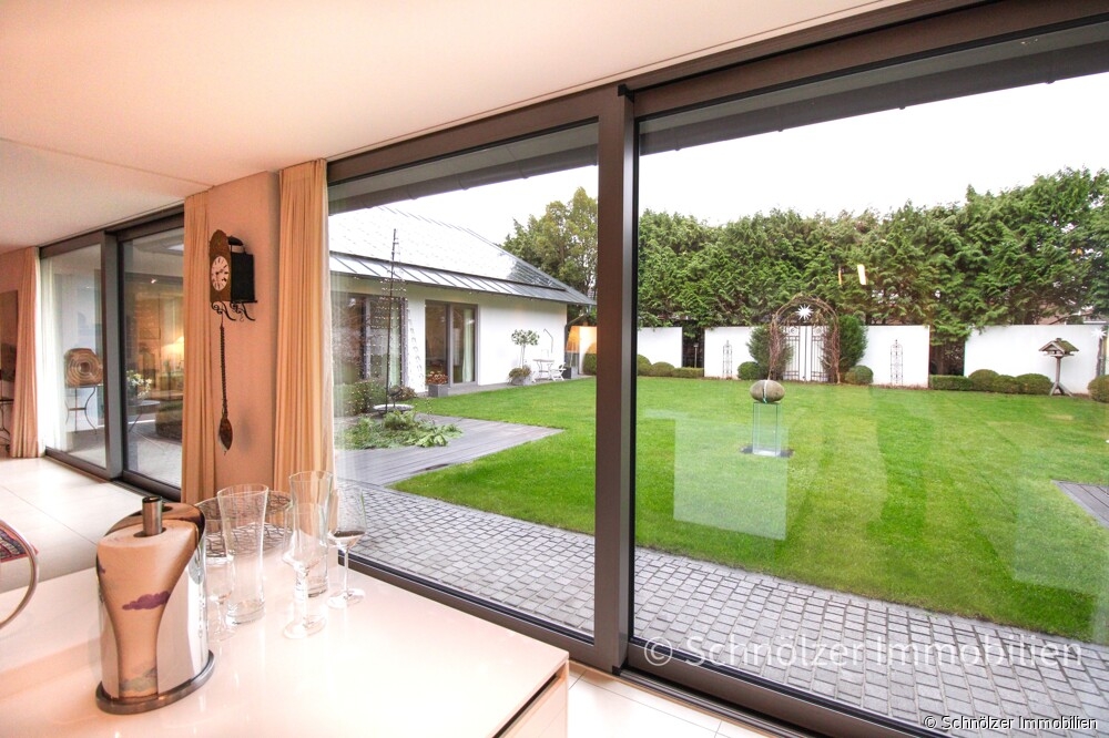 Die innenarchitektonische Gestaltung des Hauses sucht ihresgleichen: rahmenlose Schiebetüren, die im geschlossenen Zustand kaum wahrnehmbar sind und auf Wunsch Räume trennen oder öffnen, bündig eingepasste Einbauten, durchgängig einheitliche Materialien und eine Deckenhöhe von 2,60 m schaffen eine klare, ruhige Linienführung, die Eleganz und Zeitlosigkeit ausstrahlt. Bodentiefe, dreifach verglaste Fensterelemente lassen die Räume erhellen und öffnen den Blick in den stilvoll angelegten, nicht einsehbaren Garten. Von jedem der Räume hat man einen Blick ins Grüne, von nahezu jedem Zimmer gelangt man zudem direkt hinaus ins Freie – ein Wohngefühl, das Freiheit schenkt und Innen- und Außenbereich mühelos miteinander verschmelzen lässt. Die überdachte Loggia erweitert diesen Lebensraum und lädt zu entspannten Momenten in geschützter Atmosphäre ein.