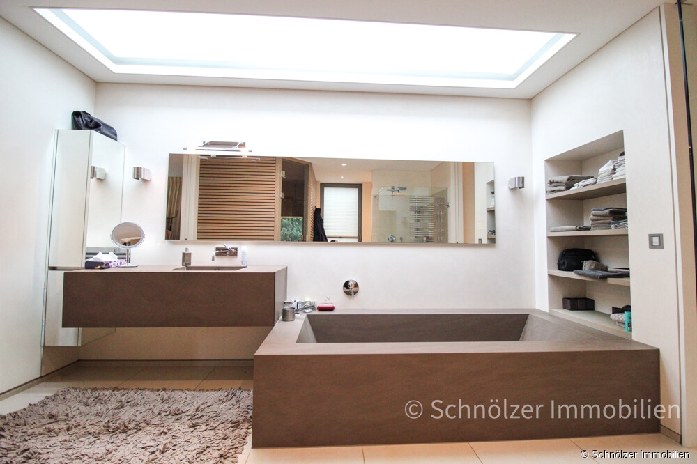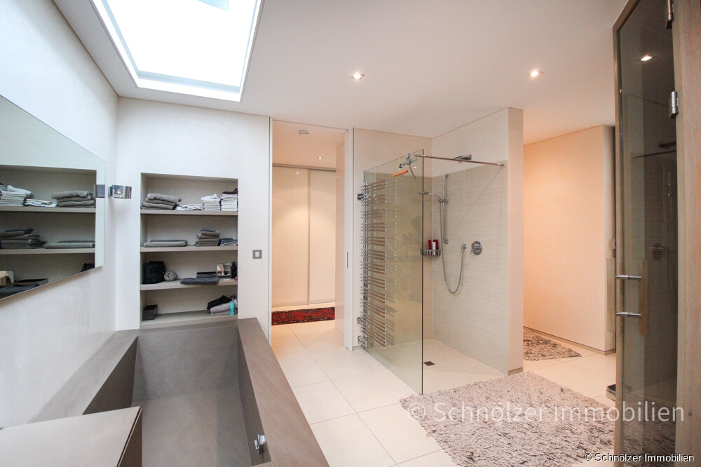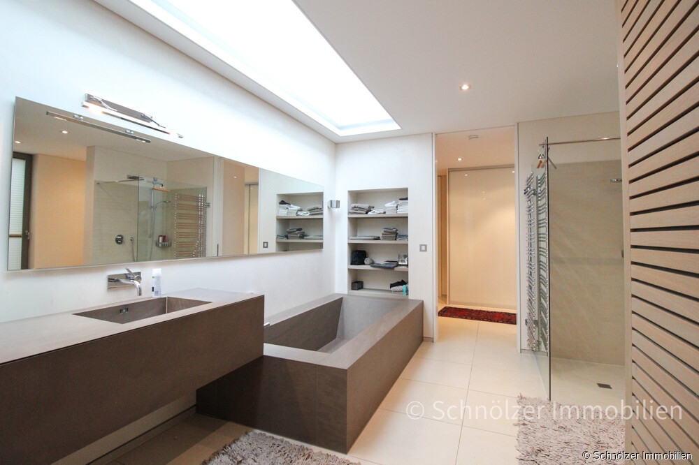 Das en-suite-Bad bildet einen architektonischen Höhepunkt des Hauses. Klare Linien, hochwertige Materialien, eine ruhige Gestaltung und intelligente Lichtführung bestimmen den Raum. Ein in die Decke integriertes Lichtfenster sorgt zusätzlich ganztägig für natürliches, gleichmäßiges Tageslicht. Ergänzt wird dies durch ein bodentiefes Fenster mit Terrassenzugang.